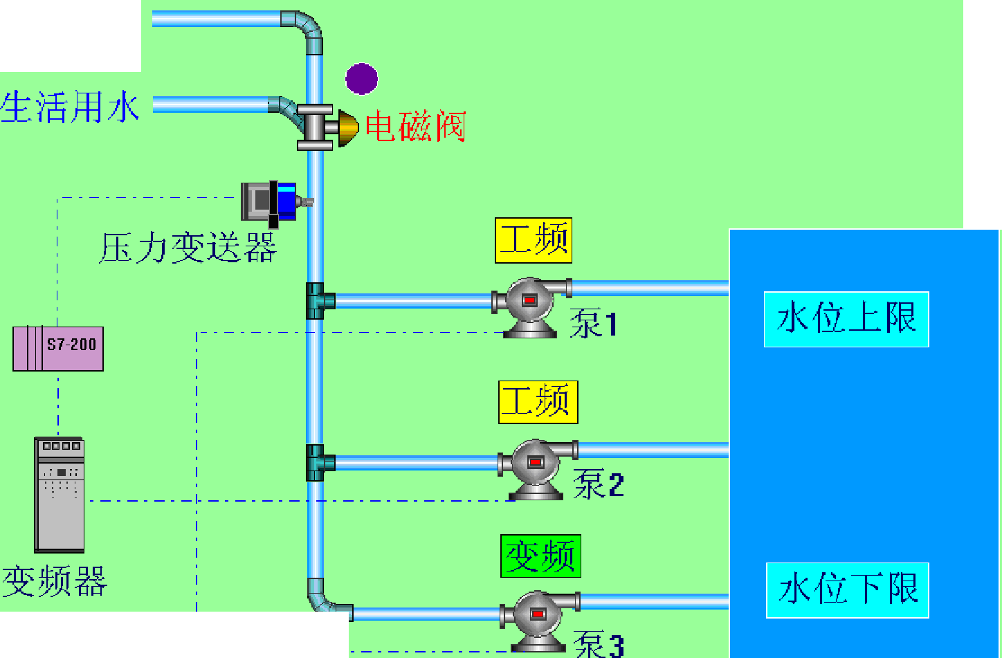 采用變頻器啟動(dòng)和停泵,無(wú)啟動(dòng)電流,延長(zhǎng)水泵壽命